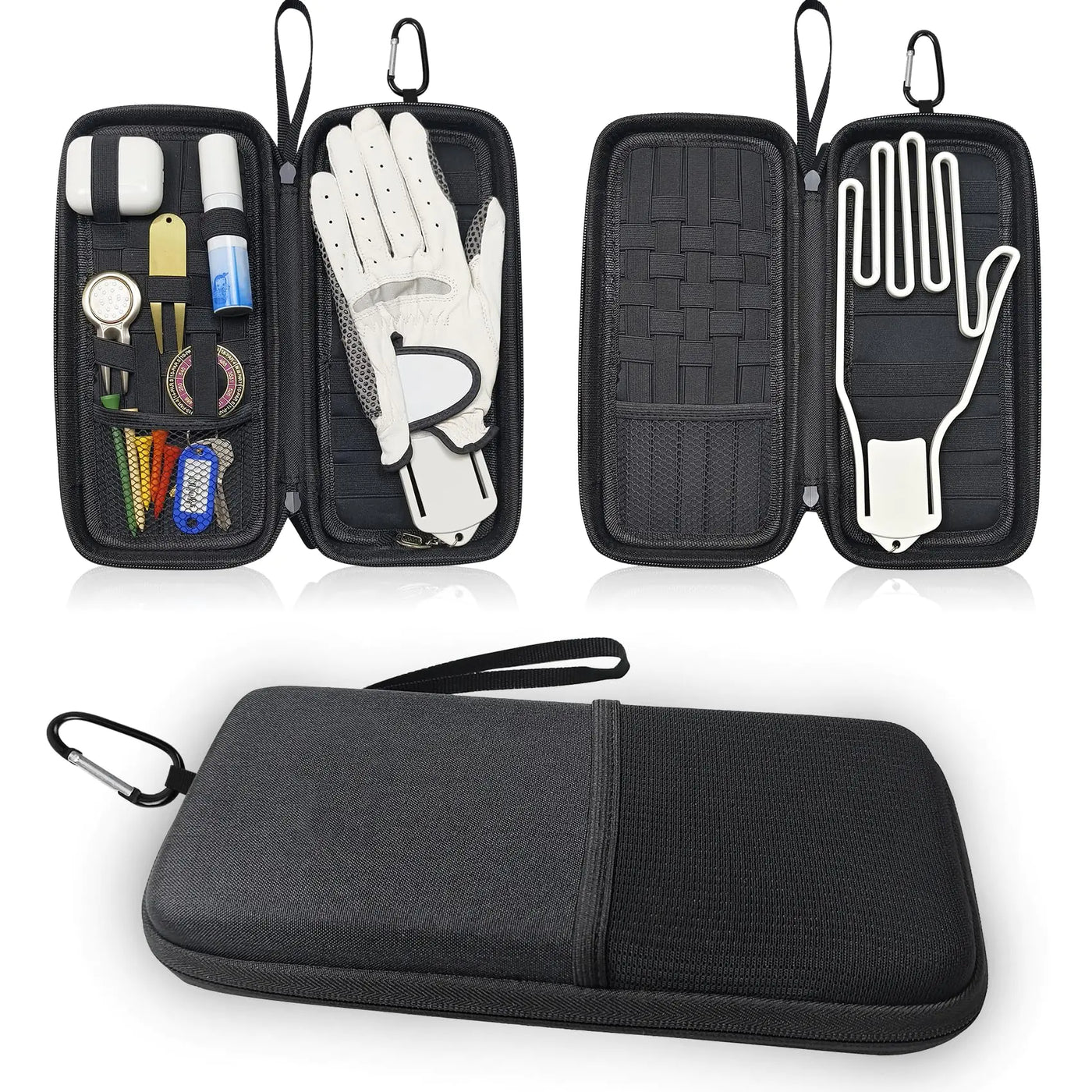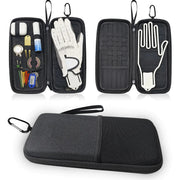 [KEEP GLOVES FLAT AND DRY -- This golf glove box has a plastic holder that helps keep gloves in shape and prevents them from wrinkling. Our Golf Glove Box not only stores gloves but also cares for them as an important golf accessory with perfect moisture management and a glove shaper to keep your gloves fresh while prolonging the life of your gloves. MORE INTERNAL SPACE -- While some glove bags have a bulky liner this compact golf organiser retains that space allowing you to store more gloves big gloves or no gloves! Left side right side winter summer or oversized it will organise your gloves without compromising space for other essentials. Gloves not included. Securely store your valuables - heavy duty clips secure the organiser to your golf bag. This hard case golf accessory organiser has a large mesh pocket inside. It comfortably and securely stores your mobile phone keys and other golf and non-golf essentials. The glove box will become part of your golf bag. No more searching for gloves in the pockets of your golf bag. HIGH QUALITY MATERIALS - 75° Rigid EVA Protective Foam Case with Waterproof Zip - Protect your valuables on the course. The sealed activated carbon lined case is waterproof to ensure protection in all weather conditions. Can be carried in a bag caddy car rucksack suitcase or at home. EASY TO CARRY AROUND - Sewn-in carabiners attach this golf travel bag to a bag or belt loop for easy access. Gloves can be placed on the outside for your quick access. It measures 10x5x1.5" (LxWxD) and weighs only 9.3 oz. FITS ALL GOLF ESSENTIALS -- The glove pocket has a zip design with an inside mesh pocket for golf tools keys cards and most mobile phones! The elasticated divider pocket doubles as a golf tee golf marker and golf tool pocket.]
