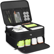[Odor-Absorbing: The golf trunk organizer is fully lined with Active Carbon Fabric to absorb odors not just cover them up! Additionally the bottom features ventilation holes to disperse odors and keep the interior dry 2-Layers Large Storage: The golf trunk organizer measures 19" L x 15" W x 10.5" H. The bottom layer can hold up to two pairs of shoes size 13 (US) for men. The top layer offers ample space for clothes socks towels gloves and other accessories Neat & Organized: The upper compartment has four hook-and-loop dividers allowing you to create up to five sections ensuring everything is neatly organized and easily accessible. The lid also features three zippered mesh pockets for additional storage Durable & Waterproof: The exterior is made from nylon Oxford fabric which is waterproof durable and tear-resistant. This material protects your shoes while also keeping your backpack or car trunk clean from dirt caused by shoes Trunk Organizer for Any Occasion: The golf trunk organizer is perfect not only for sports but also for outdoor travel or work ensuring your trunk has a dedicated space for shoes and other accessories]